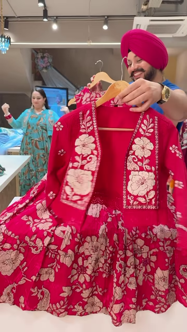 The outfit’s vibrant red base instantly evokes a sense of festivity and grandeur. Red is a classic color in traditional fashion, symbolizing celebration, strength, and auspiciousness. The richness of the hue is beautifully offset by white floral embroidery, which adds contrast and sophistication to the overall design.