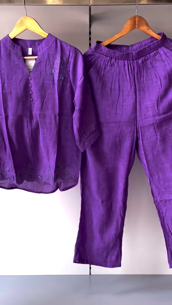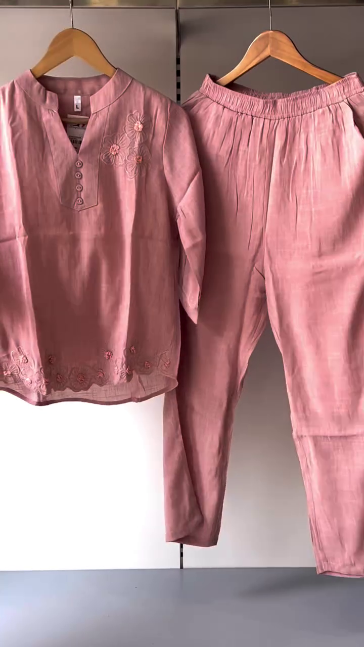 • Design & Craftsmanship: This stylish co-ord set is a perfect fusion of comfort and elegance, featuring a beautifully embroidered floral design on a refreshing lime green base. The top is designed with a smart mandarin collar, a button-down placket, and three-quarter sleeves with roll-up detailing, offering a contemporary touch to the classic silhouette. The intricate embroidery on the yoke and hem adds a graceful charm, making this set a standout piece.