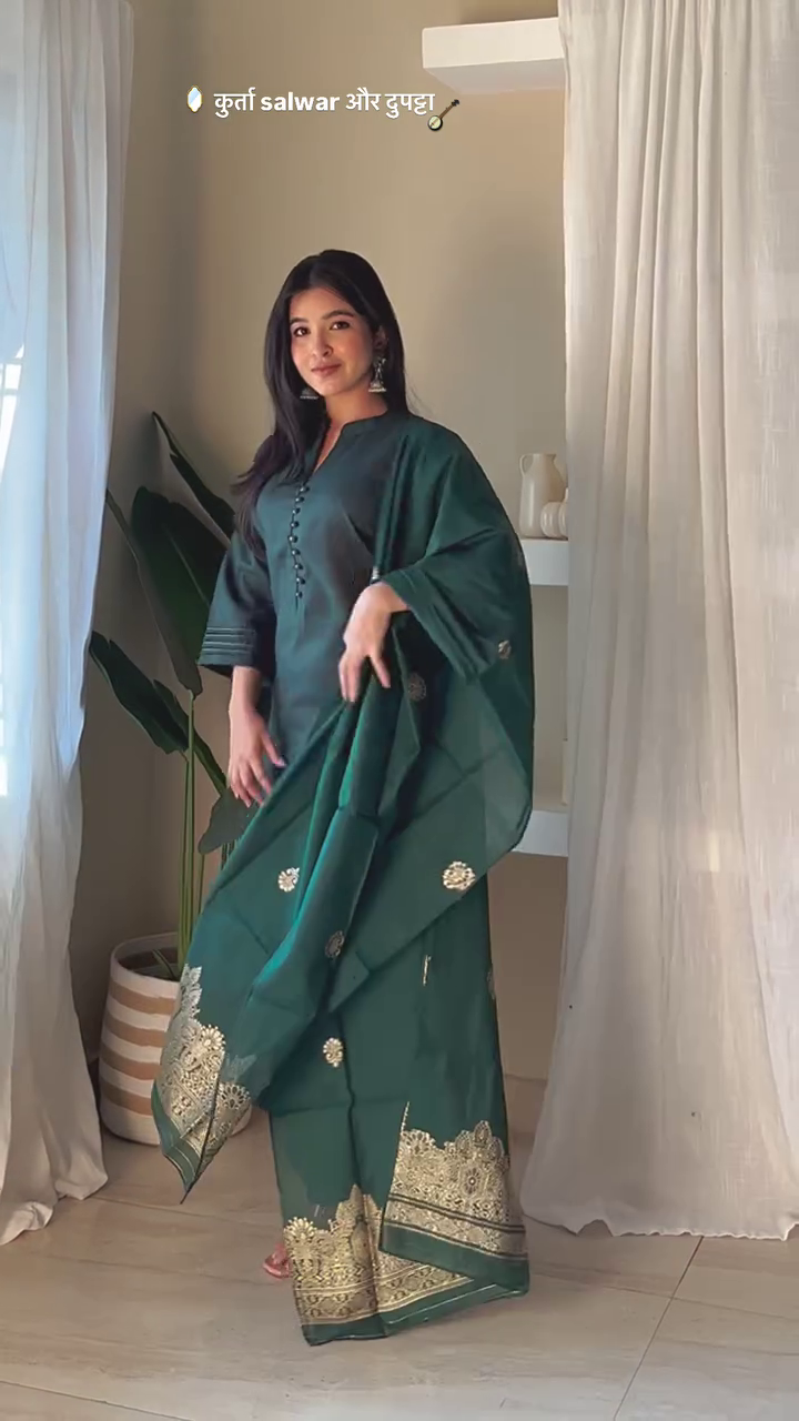 This sophisticated yet understated kurta salwar set combines traditional styling with contemporary elegance. The vibrant magenta shade is complemented by delicate golden accents on the dupatta, creating a balanced festive look. The comfortable silhouette makes it perfect for day-long wear during special occasions while maintaining a graceful appearance.