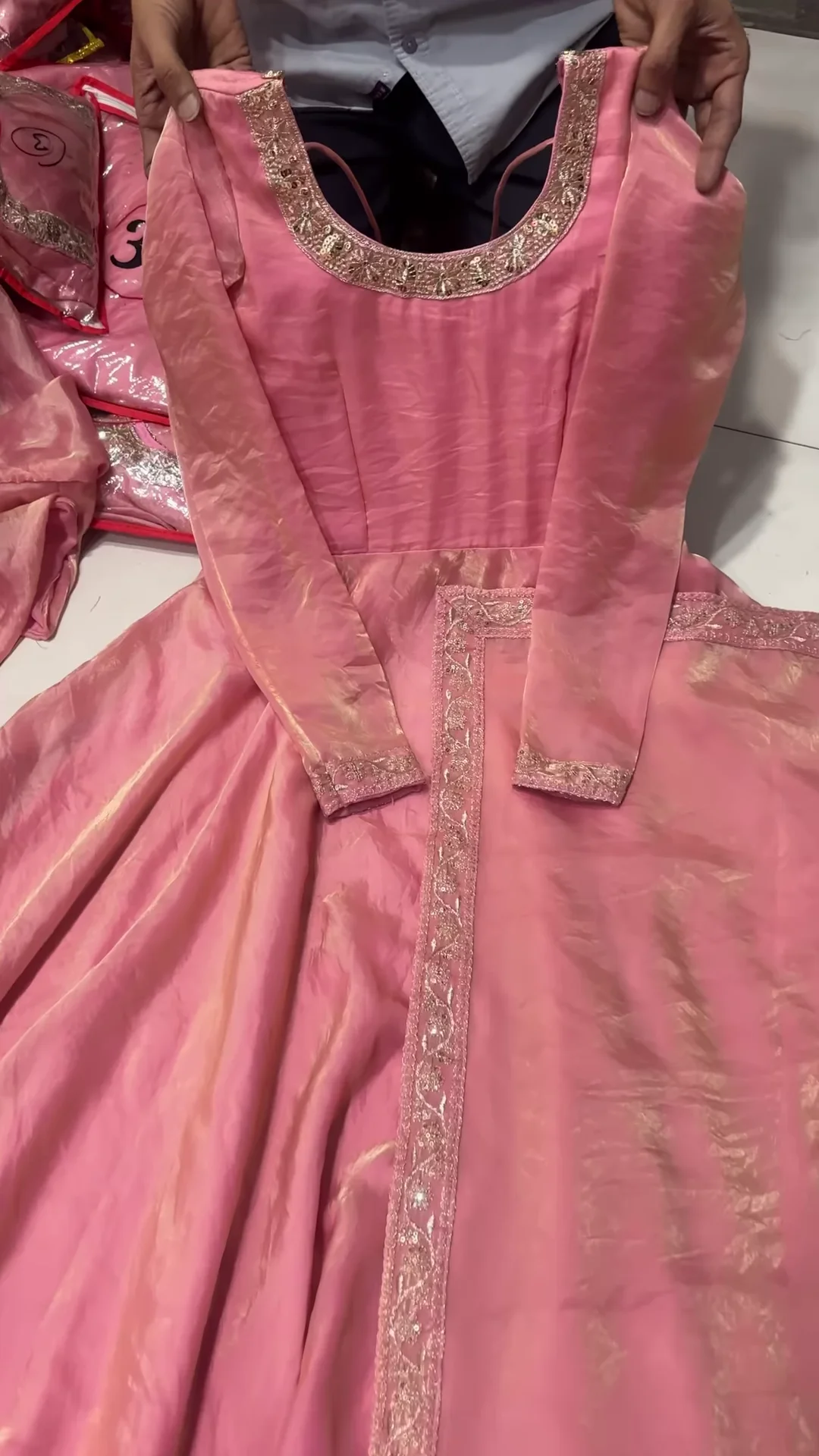 Drape yourself in elegance with this stunning 3-piece Anarkali suit set, designed to bring out your inner diva. Crafted from luxurious fabric with a subtle sheen, this pink Anarkali features a flared silhouette, full sleeves, and an intricately embellished neckline. Paired with a matching churidar bottom and lightweight dupatta, this ensemble is perfect for festive occasions, weddings, and special gatherings.