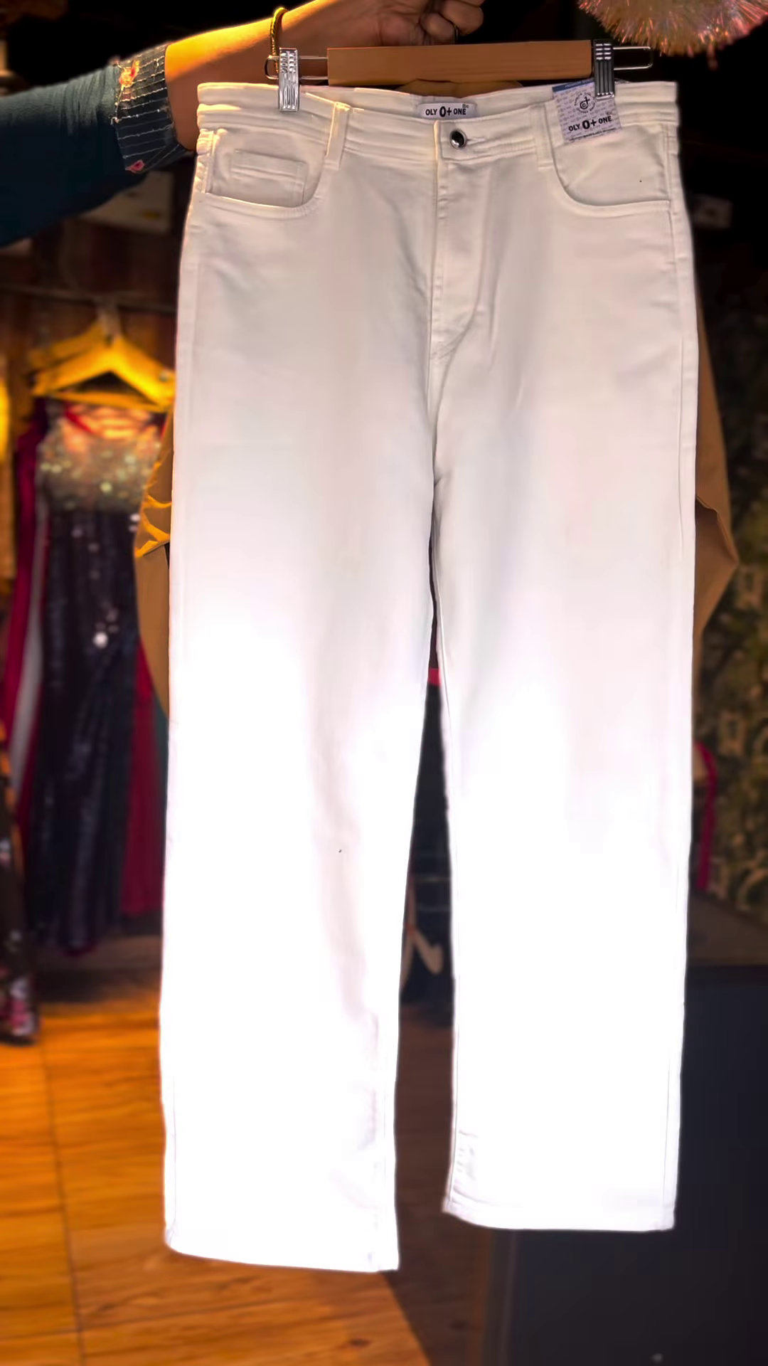 Bottom Wear: High-waisted white straight-leg pants for a clean, trendy look