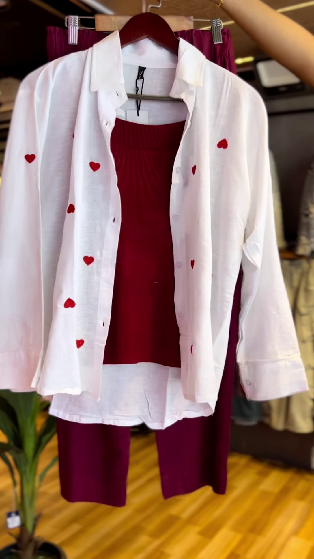Add a touch of romance to your wardrobe with this White & Red Heart Embroidered Co-ord Set. Featuring a lightweight, semi-sheer white button-up shirt, delicately embroidered with tiny red hearts, this set brings a fun yet sophisticated vibe. The ribbed sleeveless maroon inner top pairs beautifully with the coordinated maroon straight-fit pants, making it a stylish choice for casual outings, brunches, and date nights.